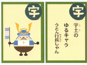 読み札の裏には解説も付いており、楽しく遊びながら宇土の歴史を学ぶことができます。最後の「ん」は「宇」として、マスコットキャラの「うとん行長しゃん」を採用しています。