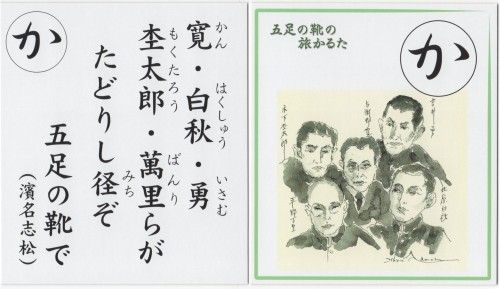 このカルタは、天草市が日本近代文学史上に大きな足跡を残した「五足の靴」について多くの人に知ってもらいたいとの意向から、熊本保健科学大学の小野友道氏に依頼し製作されたものです。