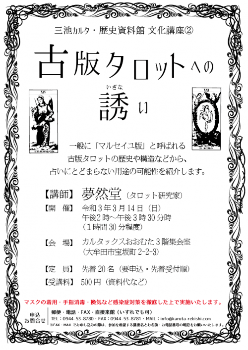 2018年に開催した当館のタロット企画展「TAROT WORLD」でも監修を務めたタロット研究家「夢然堂」が、タロットの歴史や占い以外の用途についてお話しします。