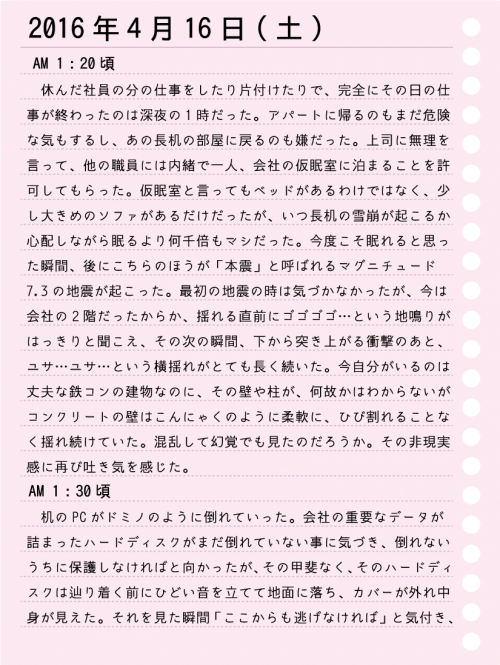 本日の更新は、後に本震が発生した2016年4月16日の手記を掲載します。