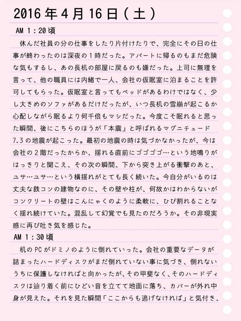 休んだ社員の分の仕事をしたり片付けたりで、完全にその日の仕事が終わったのは深夜の1時だった。アパートに帰るのもまだ危険な気もするし、あの長机の部屋に戻るのも嫌だった。上司に無理を言って、他の職員には内緒で一人、会社の仮眠室に泊まることを許可してもらった。仮眠室と言ってもベッドがあるわけではなく、少し大きめのソファがあるだけだったが、いつ長机の雪崩が起こるか心配しながら眠るより何千倍もマシだった。今度こそ眠れると思った瞬間、後にこちらのほうが「本震」と呼ばれるマグニチュード7.3の地震が起こった。最初の地震の時は気づかなかったが、今は会社の2階だったからか、揺れる直前にゴゴゴゴ…という地鳴りがはっきりと聞こえ、その次の瞬間、下から突き上がる衝撃のあと、ユサ…ユサ…という横揺れがとても長く続いた。今自分がいるのは丈夫な鉄コンの建物なのに、その壁や柱が、何故かはわからないがコンクリートの壁はこんにゃくのように柔軟に、ひび割れることなく揺れ続けていた。混乱して幻覚でも見たのだろうか。その非現実感に再び吐き気を感じた。