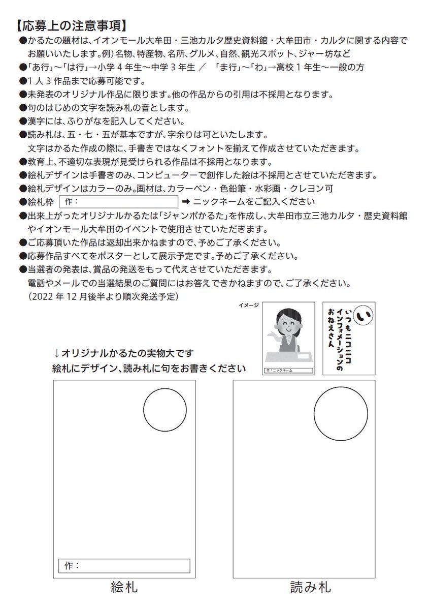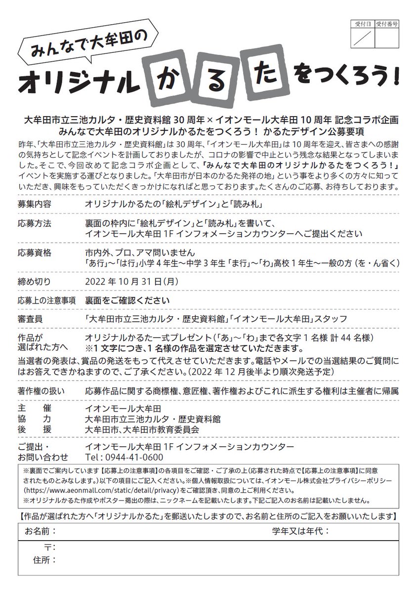 大牟田市立三池カルタ・歴史資料館と、イオンモール大牟田の記念コラボ企画として「みんなで大牟田のオリジナルかるたをつくろう!」イベントを実施する運びとなりました。それにあたってカルタの絵札と読み札を募集しています。