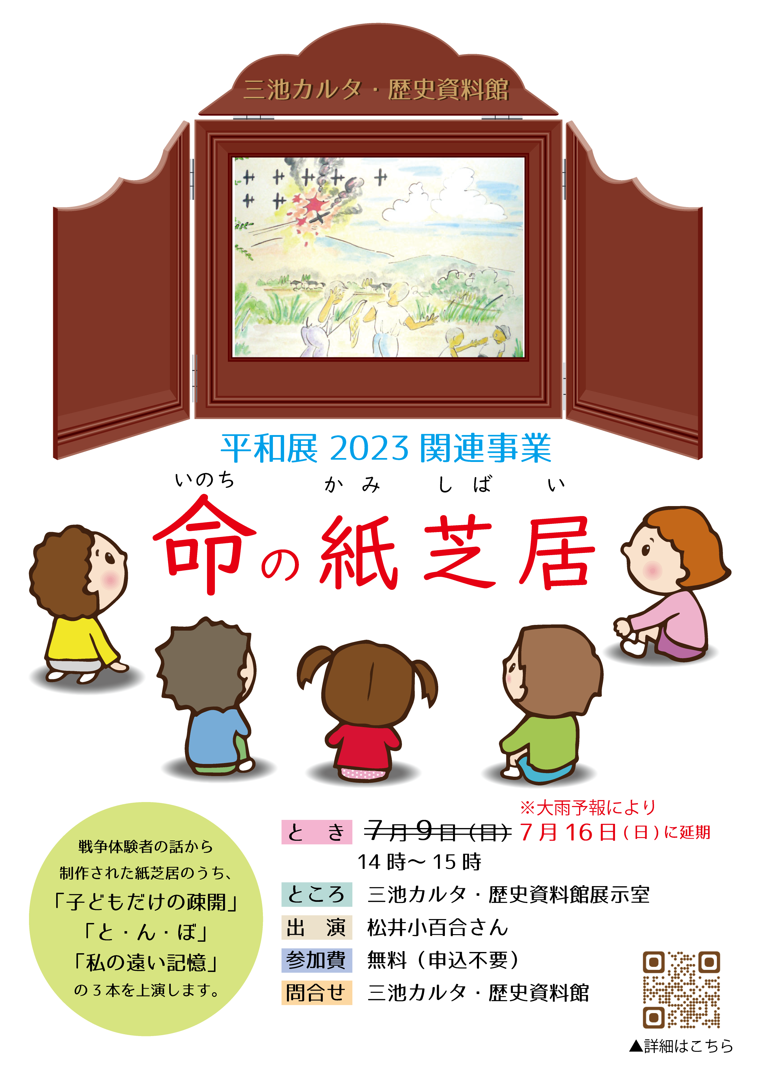 2023年7月4日(火)から開催される平和展2023「戦時下の子どもたち」に合わせて、戦争経験者の話から大牟田空襲などのオリジナル紙芝居を制作・実演されている松井小百合さんをお招きし、「子どもだけの疎開」「と・ん・ぼ」「私の遠い記憶」の3本の紙芝居を上演します。