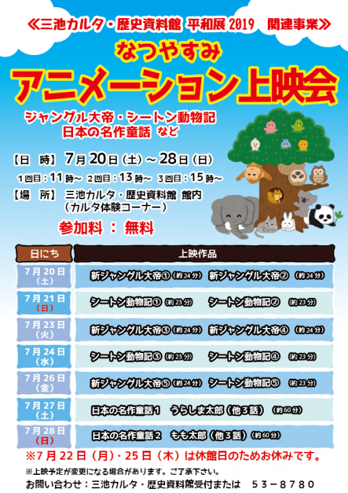 なつやすみアニメーション上映会 2019 7/20 2019/07/20 ジャングル大帝やシートン動物記などの動物の名作アニメや、みんなが知っている日本昔ばなしをアニメにしたものを上映します!! スケジュールは下記の画像でご確認ください。 朗読座「奇跡のプレイボール」<終了しました> 古い投稿 > 朗読座「奇跡のプレイボール」<終了しました> < 新しい投稿 第28回九州新人かるた大会<終了しました> イベント・講座一覧へ戻る