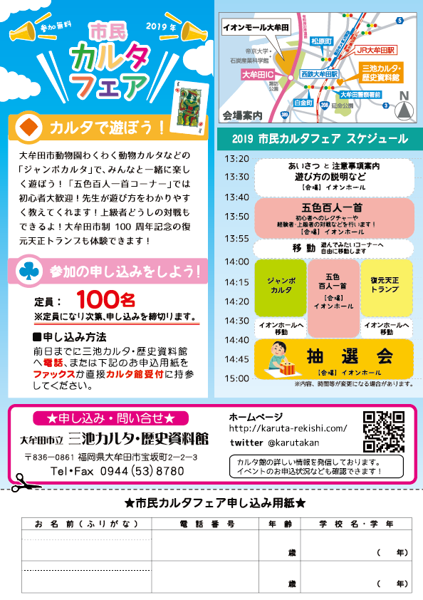 前日までにカルタ館に電話・ファックスで申込みください。なお、確実に参加されたい方には、事前申込みをおすすめしています。