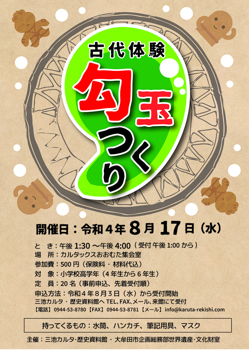 8月17日(水)にカルタックスおおむた3F集会室にて勾玉(まがたま)作りを開催します。