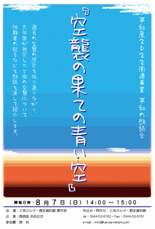 過去の空襲の歴史を振り返りながら、大牟田が被災した5回の空襲について、体験者の証言などを朗読を通して紹介します。