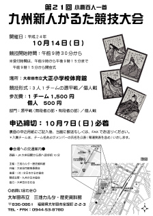 [とき] 2012年10月14日(日) [競技開始時間] 午前9時30分から [受付時間] 午前9時から午前9時15分まで [会場] 大牟田市立 大正小学校 体育館 [競技形式] 3人1チームの源平戦 / 個人戦 [部門 […]