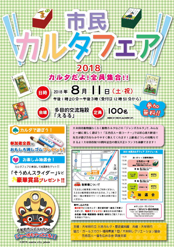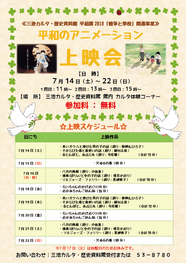 [と き] 7月14日(土)~22日(日) [時 間] 1回目:11時~ 2回目:13時~ 3回目:15時~ [場 所] 三池カルタ・歴史資料館 館内カルタ体験コーナー [参加料] 無料 [上映スケジュール] ①7月14 […]