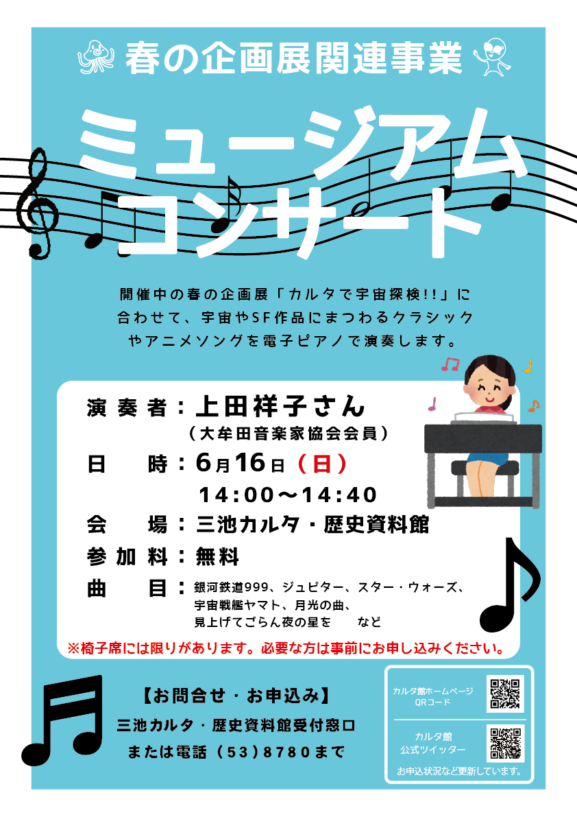 春の企画展「カルタで宇宙探検!!」に合わせて、宇宙やSF作品にまつわるクラシックやアニメソングを電子ピアノで演奏します。 [日 時] 6月16日(日) 14:00~14:40 [場 所] 三池カルタ・歴史資 […]