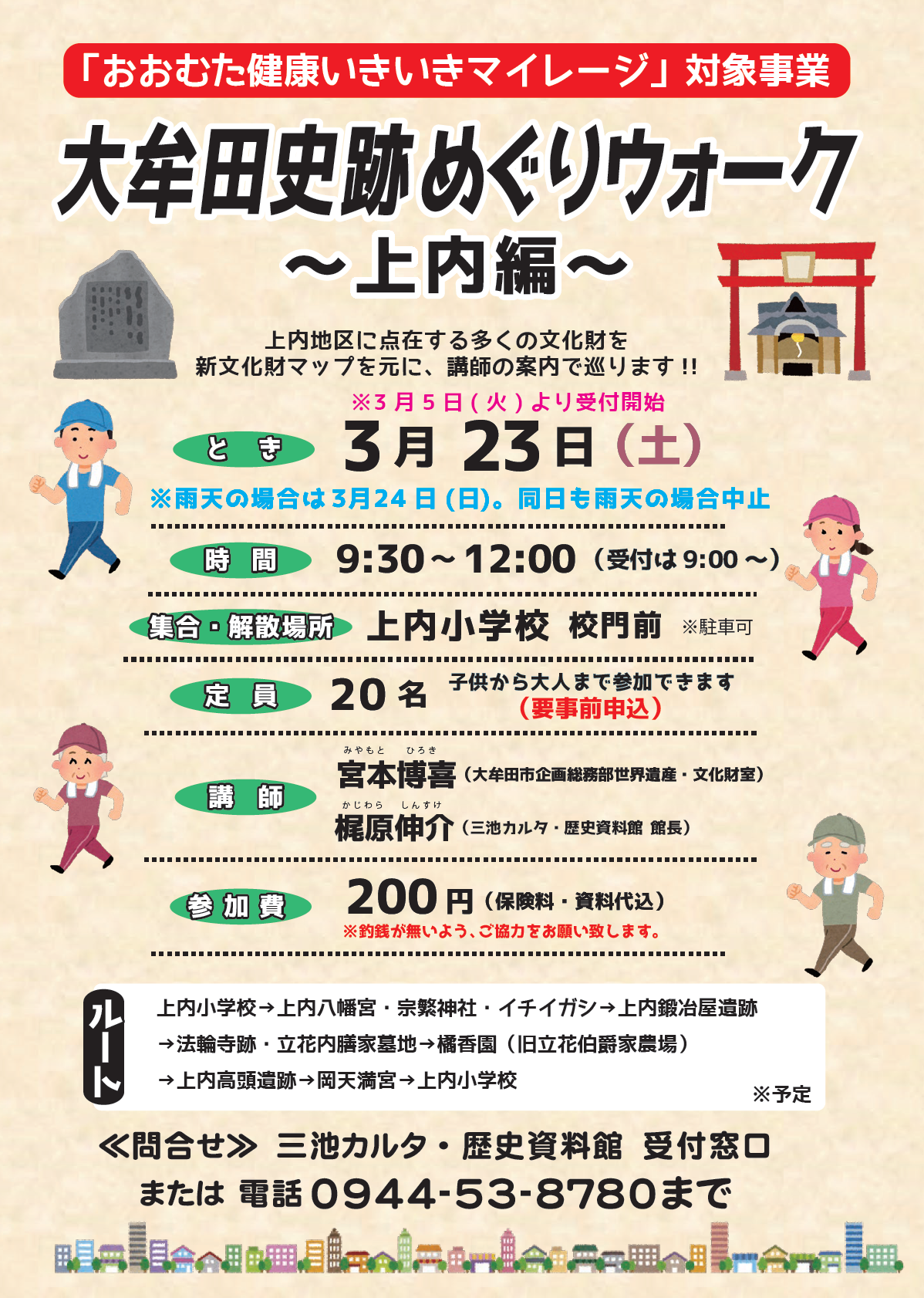 上内地区に点在する多くの文化財を新文化財マップを元に、講師の案内で巡ります! 当企画は「おおむた健康いきいきマイレージ」の対象事業です。 3月6日更新 定員に達しましたので締め切ります。たくさんのご応募、ありがとうござい […]