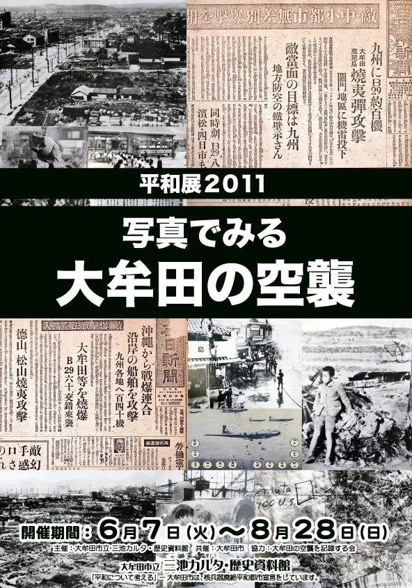 平和展2011 写真でみる大牟田の空襲戦時下の中、多くの市町村が空襲の被害にあいました。もちろん、私たちの住む大牟田市も例外ではありません。大牟田市は1944年から45年にかけて5回にわたってアメリカ軍の空襲を受け、多くの犠牲者がでました。 今回の平和展は、 […]
