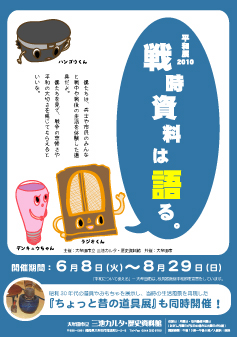 平和展2010 戦時資料は語る。戦争が終わってから60年以上がたち、私たち日本人は平和で豊かな生活をおくっています。 次第に戦争の記憶はうすれ、今では戦争を知らない子どもたちがほとんどです。 そこで当館では、戦争のおろかさと平和の大切さを見て、感じて、 […]