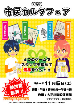 2010 市民カルタフェア今年も五色百人一首などの4つのゲームを体験してスタンプを集めよう! 4つスタンプを集めたら景品と交換できるよ! さらに、今年も抽選会で景品をゲットするチャンスが! 友達を誘ってみんなで参加しよう! [とき] 11月6日( […]