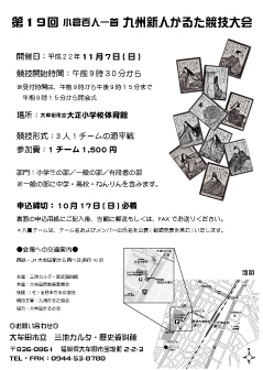 第19回 小倉百人一首 九州新人かるた競技大会[とき] 11月7日(日) [競技開始時間] 午前9時30分から [受付時間] 午前9時から午前9時15分まで [会場] 大牟田市立 大正小学校 体育館 [競技形式] 3人1チームの源平戦 [部門] 小学生の部/一般の部 […]